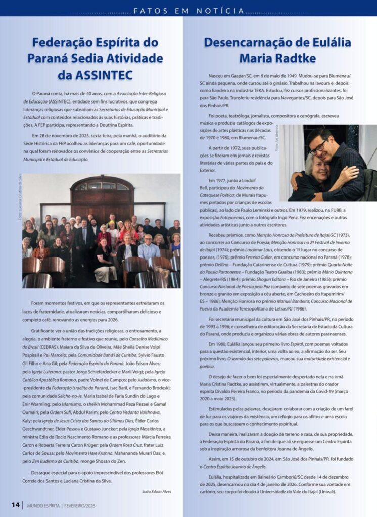 Eulália Maria Radke destacou-se como escritora, jornalista e intelectual, mantendo ao longo da vida uma produção marcada pela sensibilidade, pela reflexão e pela valorização do ser humano. Sua obra expressa inquietações existenciais e profundas observações sobre a vida, em consonância com os princípios espíritas de progresso moral e intelectual.Segundo o Espiritismo, a morte não representa o fim da vida, mas a continuidade da existência em outra dimensão. A desencarnação é compreendida como o retorno do espírito ao mundo espiritual, onde prossegue seu processo de aprendizado e evolução.